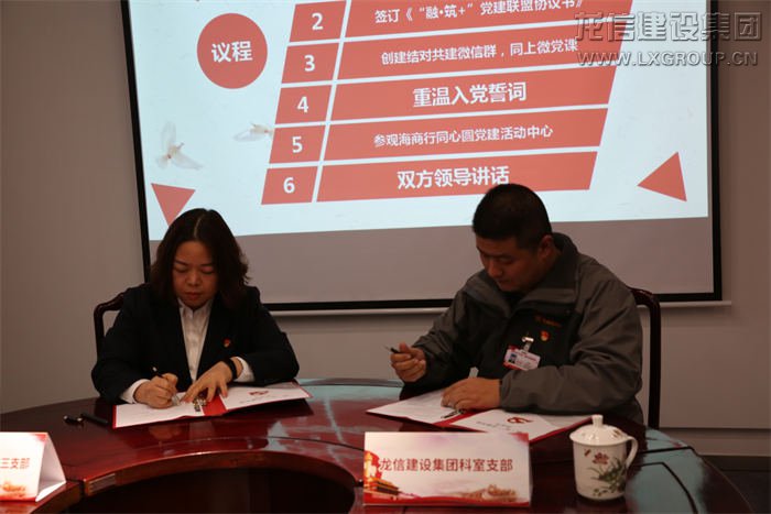 本次活動(dòng)以“融·筑+”黨建結(jié)對共建為主題,全體黨員共同重溫入黨誓詞,堅(jiān)定理想信念。龍信集團(tuán)科室支部副書記施金浩與海門農(nóng)商行機(jī)關(guān)第三黨支部書記劉曉艷共同簽訂《“融·筑+”黨建聯(lián)盟協(xié)議書》,以“黨建互促、服務(wù)互聯(lián)、專業(yè)互助、資源互享、廉政互督”為原則建立聯(lián)系、加強(qiáng)溝通,實(shí)現(xiàn)信息共享、優(yōu)勢互補(bǔ)。現(xiàn)場黨員們共同創(chuàng)建“融·筑+”黨建結(jié)對共建微信群,同上“微黨課”《讓信仰之光在心中閃亮》。隨后大家重溫入黨誓詞并參觀海門農(nóng)商銀行同心圓黨建活動(dòng)中心。